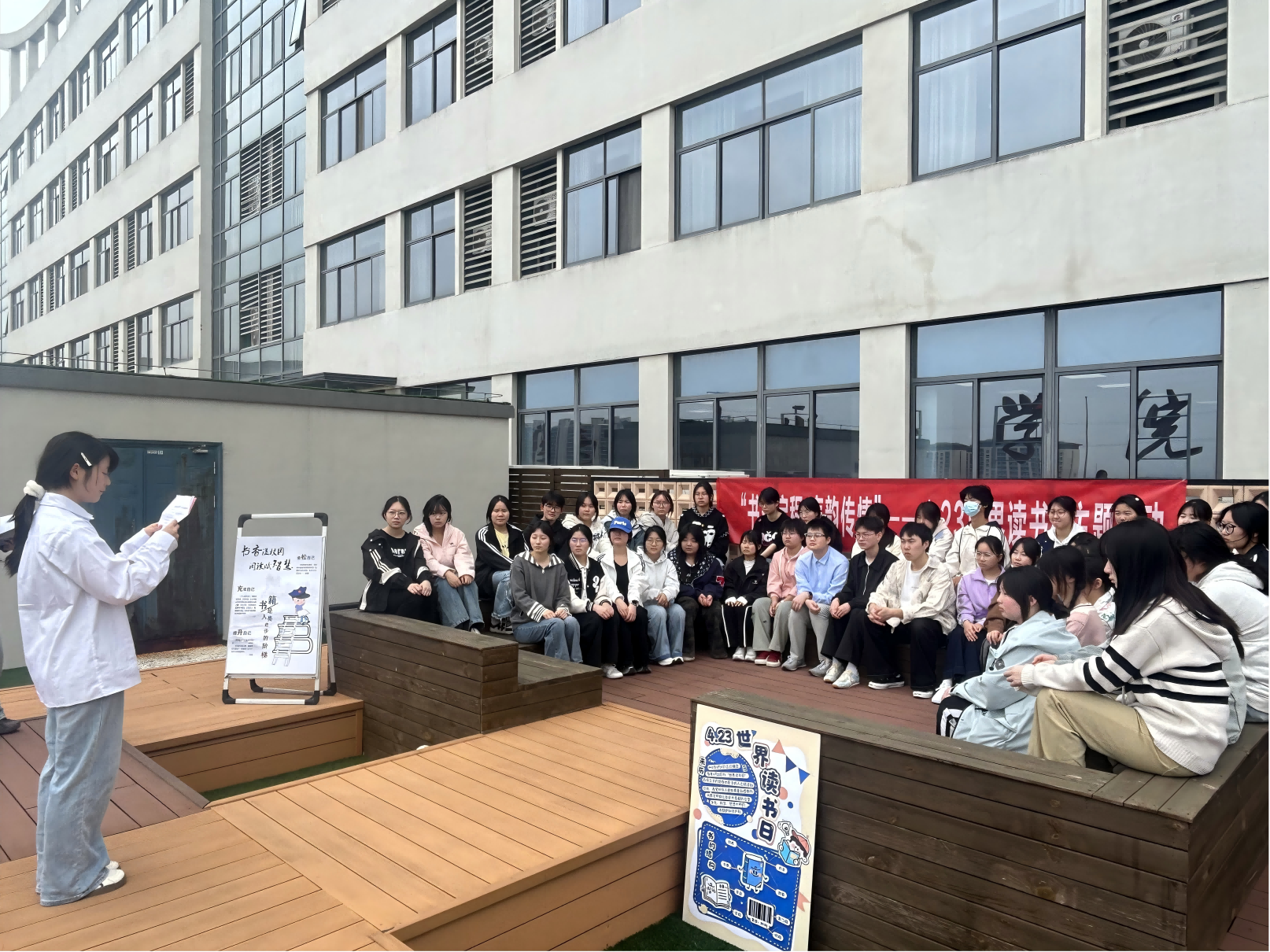 活动现场分为户外诵读分享与室内手作体验两大板块。在户外阶梯广场,同学们围坐成圈,两位学生代表手持文稿,以饱满的情感诵读经典篇目,用声音传递文字的力量。台下师生认真聆听,在朗朗书声中感受文学之美,现场还设置了读书日主题展板,清晰传递“4·23世界读书日”的文化内涵,引导同学们树立“爱读书、读好书、善读书”的理念。